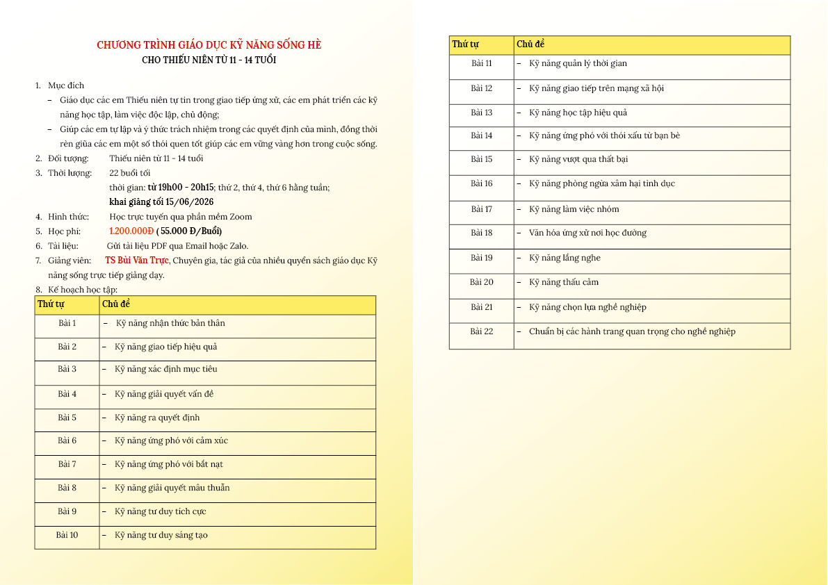 Chúng tôi hân hạnh gửi đến quý phụ huynh chương trình kỹ năng sống hè 2026 với hình thức học Online để quý phụ huynh tham khảo đính kèm.