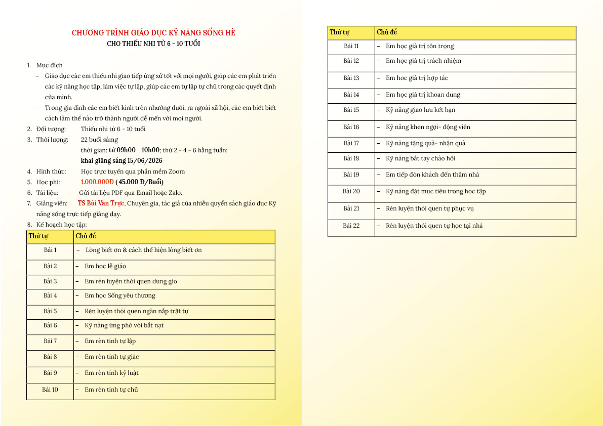 Chúng tôi hân hạnh gửi đến quý phụ huynh chương tình kỹ năng sống hè 2026 với hình thức học Online để quý phụ huynh tham khảo đính kèm.